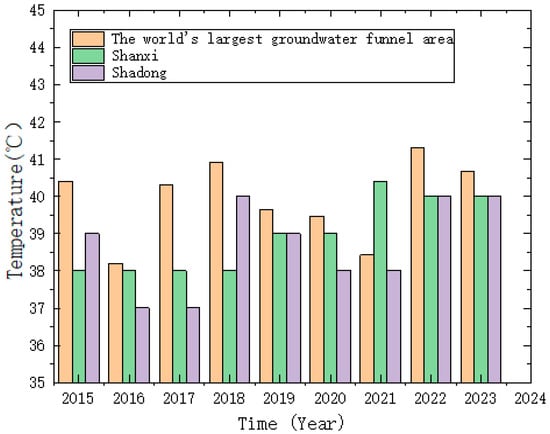 This metropolitan cluster encompasses Beijing Municipality, Tianjin Municipality, and 11 prefecture-level cities within Hebei Province. The terrain is predominantly plains interspersed with mountainous and hilly areas. Characterized by a temperate monsoon climate, the region exhibits distinct seasonal variations: hot and rainy summers contrast sharply with cold, dry winters. The Beijing–Tianjin–Hebei region exhibited a significant upward trend in summer mean maximum temperatures from 1961 to 2018, with substantial increases in extreme heat and heatwave frequency []. Compared to the reference period (2005–2014), extreme heat intensity is projected to rise by 0.71 °C and 2.12 °C by the mid and late 21st century, respectively, exceeding those under global warming alone by 0.23 °C and 0.58 °C []. Additionally, this paper investigated and organized the EHT in Shandong and Shanxi as well as the AEHT in the world’s largest groundwater depression cone from 2015 to 2023. The temperatures in Shanxi, Shandong, and the world’s largest groundwater depression cone for the past few years are shown in Table 1.