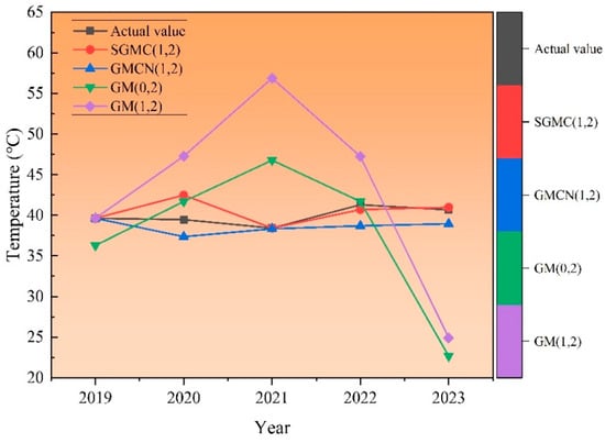 The performance metrics across the test dataset are summarized in Table 3. The SGMC(1,N) model exhibits superior predictive precision, with a MAPE of 1.97%. This represents a substantial improvement over conventional approaches, particularly when compared to the GM(1,2) (24%), GM(0,2) (16.2%), and GMCN(1,2) (3.21%) models. The enhanced fitting capability of the SGMC(1,2) variant is further visually substantiated in Figure 5, where its trajectory closely aligns with observational data, while competing models exhibit significant deviations from empirical values. Consequently, this model demonstrates strong applicability while maintaining prediction reliability. It performs particularly well in hydrological applications requiring temperature prediction within large-scale groundwater depression cones.