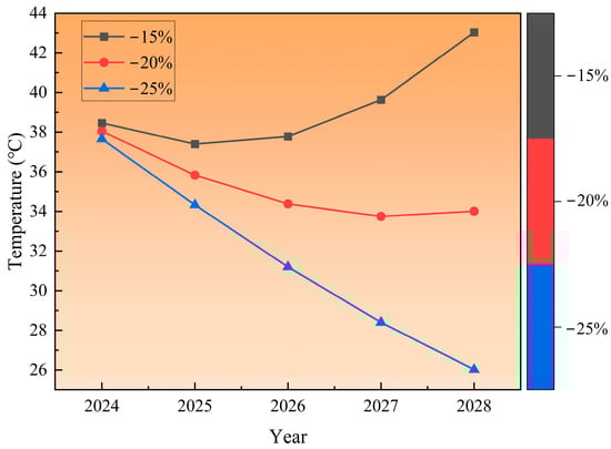 When the average growth rate of GOE is −15%, the trend of high temperatures in the world’s largest groundwater depression cone shows a decrease first, followed by an increase. This trend of temperature change is unstable. When the growth rate is −20% or −25%, the temperature curve as a whole shows a downward trend, and the lower the GOE is, the lower the temperature is. Therefore, when the GOE decreases by more than 15%, the improvement in temperature is more obvious. And the larger the reduction in GOE is, the faster the rate of temperature decrease will be. This is mainly due to the reduction in and control of GOE, which mitigates the risks associated with surface drought, collapse, and low precipitation. Fu et al. revealed that severe shortages in groundwater resources can lead to an increase in regional temperatures []. This finding is, to some extent, consistent with the results presented in this paper. Therefore, reducing the extraction of groundwater would help alleviate the stress on regional hydrological systems and contribute to the stabilization of local climatic conditions.