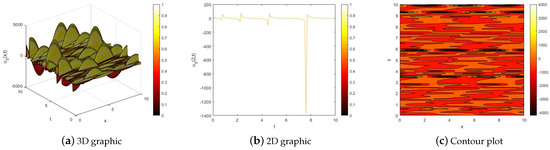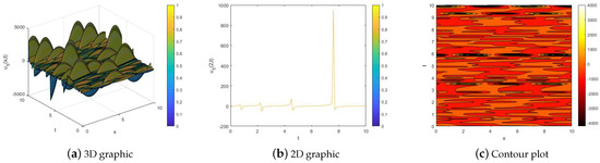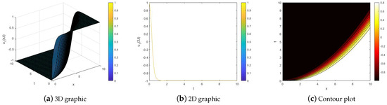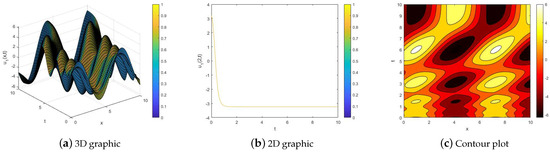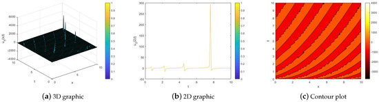 In this section, we illustrate three-dimensional, two-dimensional, and contour maps of the modulus length as well as the real and imaginary parts of when , and , as shown in Figure 1, Figure 2 and Figure 3. Moreover, we plot three-dimensional, two-dimensional, and contour maps of the modulus length as well as the real and imaginary parts of when , and , as shown in Figure 4, Figure 5 and Figure 6.