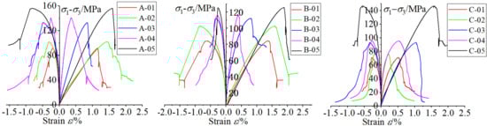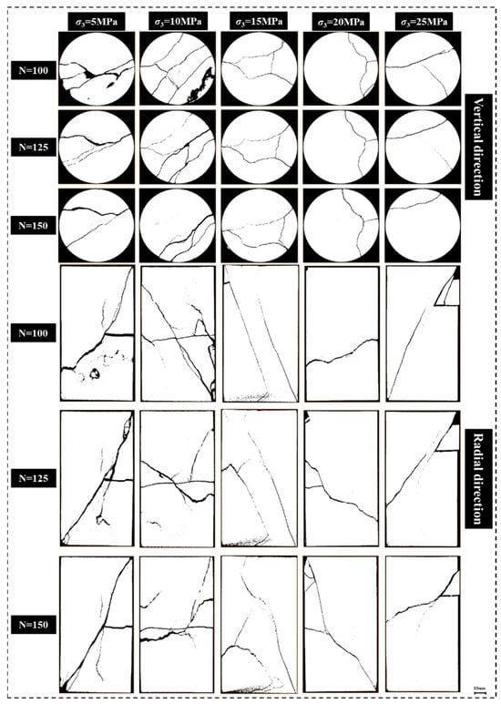 34]. However, the existence of confining pressure provides a limiting force for the radial deformation of shale, and the greater the confining pressure is, the stronger the restriction is. The fracture distribution exhibits a single shear shape (almost no radial tensile failure) when the confining pressure is high enough. This occurs because the axial direction of the shale will experience macroscopic shear failure before the radial direction (deformation is limited).