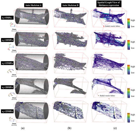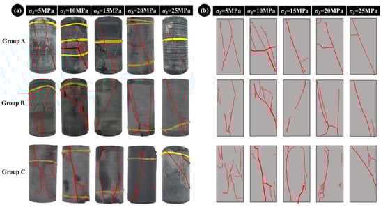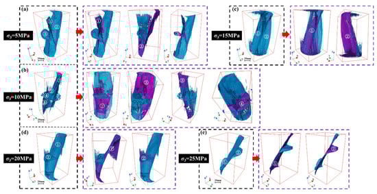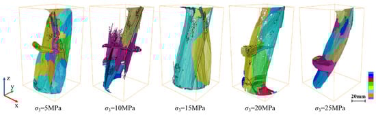 Figure 11a). The sample has more than three main fractures that cross over when the confining pressure is 5–10 MPa. The main fractures are surrounded by a complicated fracture network made up of minor fractures. At a confining pressure of 15 MPa, the characteristics of the fracture distribution within the sample are obviously different. The main fractures are reduced to 2, with some minor fractures. Axial shear fractures are present in nearly all of them, while there is no significant radial fracture dispersion. The sample exhibits a single main fracture and several smaller fractures running parallel to the axial direction of the main fracture when the confining pressure reaches 20 MPa. The internal fractures of the sample show a flat main fracture accompanied by a small oblique fracture. When the confining pressure reaches 25 MPa, the geometric shape is single, and there is no minor fracture surrounding the main fracture at the same time.