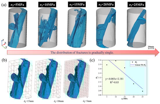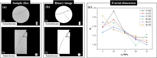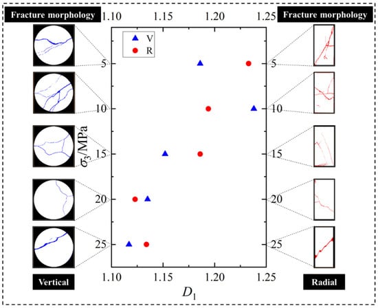 Figure 10). The findings show that when confining pressure increases, the fractal dimension reduces linearly in both directions. The failure modes in the vertical and radial directions also show obvious regular changes with the increase in confining pressure. The failure mode of the slice in