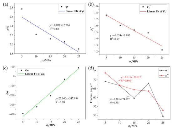 Figure 14d). The fracture angle obtained by relying on the main fracture has poor regularity with the change trend of the confining pressure. The fracture angle determined by the greatest shale fracture exhibits an unusually high value at a confining pressure of 20 MPa. It is evident from the fitting correlation coefficient R
