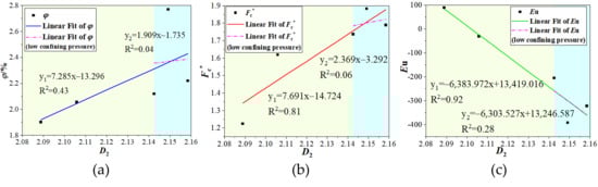 It is in line with the previously discussed sample failure mode. Concurrently, a linear decreasing trend is observed in the relationship between the confining pressure and the 2D fractal dimensions in both directions, as shown in