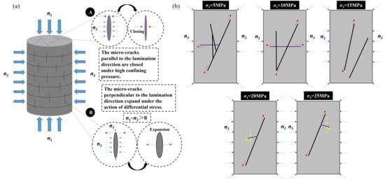 σ3 > 0, the micro-fractures perpendicular to the lamination direction expand prior to the micro-fractures parallel to the lamination direction. The micro-fractures perpendicular to the lamination direction will continue to grow and intersect as the axial stress increases, eventually leading to macroscopic fracture.