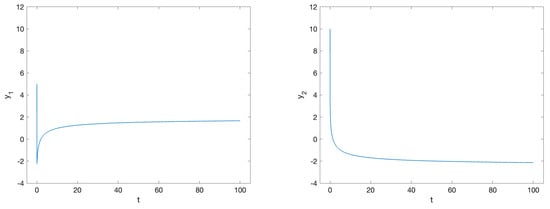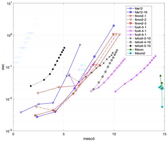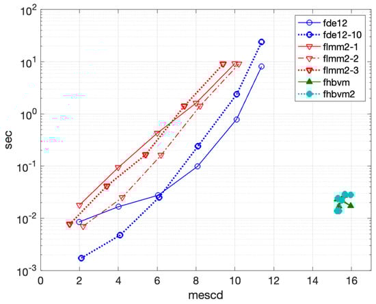 - flmm2: we set the parameters tol to and itmax to , respectively. Moreover, we shall denote by flmm2-1, flmm2-2, and flmm2-3 the usage of the code with the trapezoidal rule, the Newton–Gregory formula, and the BDF2 method, respectively;