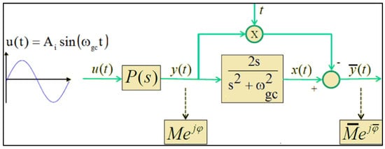 Suppose that, apart from the pure sine of frequency , the output signal y(t) also exhibits some other sine signals of frequencies, , due to stochastic disturbances and noise. Then, the corresponding sine signal will be amplified by the filter with a bounded gain , but at the same time it will be amplified by the multiplier with the unbounded time signal, t. The effect will be an unbounded signal increasing with time, as resulting from (3). A solution to overcome this problem is based on a modification of the basic scheme in Figure 1 as indicated in Figure A1a, where yTR(t) and ySS(t) are the transient and steady-state parts of the output signal y(t), with the transient component going to zero (or to a constant value for an integrating system).