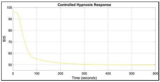 The imposed cutting frequency for this PID controller is 0.0025 rad/s. This finding is consistent with the current state of knowledge in the field of anaesthesia control, which posits that patients’ responses to these medications are slow []. The closed-loop response for one patient is presented in Figure 2.
