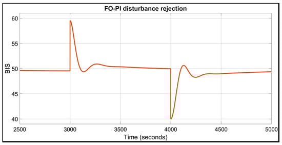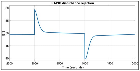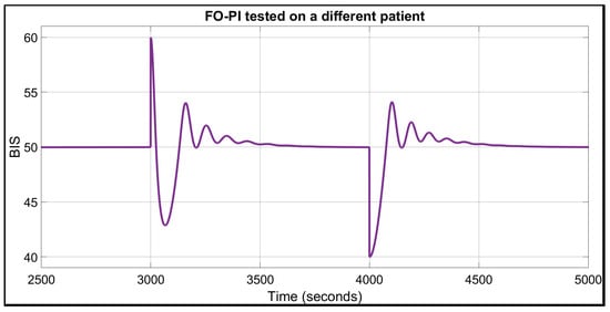 As shown in Figure 7, the BIS signal exhibits a highly oscillatory behaviour, which could be unpleasant or even harmful for the patient. The TT performance is approximately 180 s, which is nearly three times longer than in the nominal case. The final performance indicator, the IAE, is 5542, which is more than twice the value observed in the nominal case, further emphasising the need for personalised control strategies. The patient’s characteristics were: age = 50 years, height = 186 cm, weight = 96 kg, sex = male. The FO-PID response had worse performance due to the derivative component, which is more sensitive to variations in the parameters.