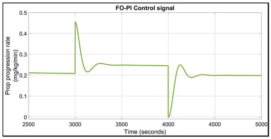 The parameters of the FO-PI tuned for the nominal patient are: kp = 0.0247, ki = 0.00059, µ = 1.1, and the structure of the controller is provided in (18). The imposed constraints were: ωgc = 0.0025 rad/s, PM = 50° and the iso-damping property. Figure 4 illustrates the disturbance rejection performance of this controller. Figure 5 presents the control signal, which verifies the clinical limitations of Propofol infusion.