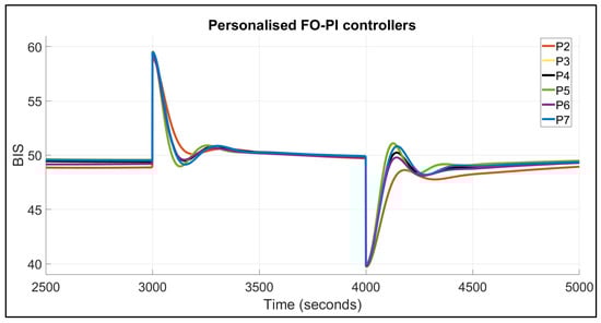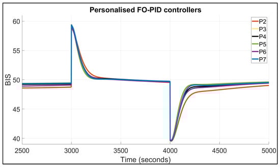 Figure 8 and Figure 9 provide the graphical visualisation of Table 1. The results of this research are according to the clinical procedures. The nominal patient was not included in these figures for increased readability, as it has already been included in Figure 4 and Figure 6. Both proposed structures for the fractional-order controllers proved efficient in maintaining the BIS level in the safe range and also provide fast disturbance rejection loops. The FO-PI controller proves to be faster than the FO-PID; however, the latter provides a smoother signal with no oscillations.