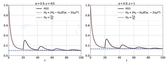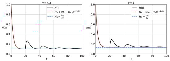According to [], the simplest bulk viscosity scenario in (26), following Eckart’s formulation, arises when the viscosity term depends on H, say . Provided that , Equation (26) can be solved explicitly via quadratures: