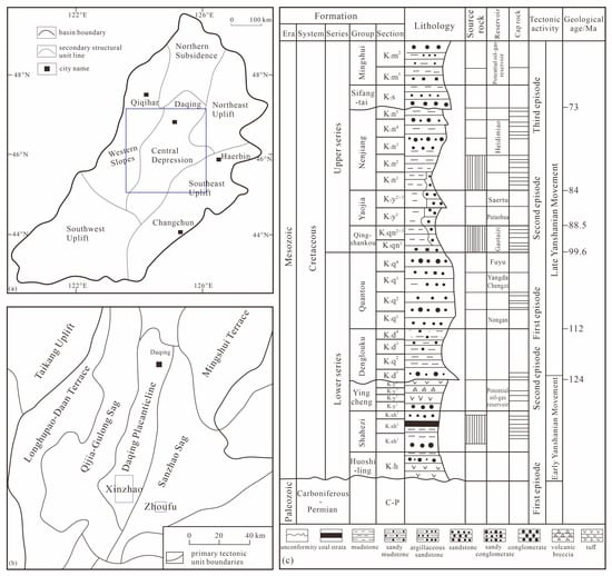 The location and tectonic characteristics of research area. ((a) refers to structural characteristics of Songliao basin; (b) indicates geographical location of Daqing placanticline and Sanzhao sag; (c) is the stratigraphic features in the Mesozoic formation in the research area).