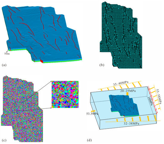 Through detailed seismic data interpretation, stratigraphic and fault datasets are systematically extracted to develop a structurally constrained geological model (Figure 2a), integrating subsurface structural features for subsequent numerical simulations. The fault-strata model (Figure 2a) was analyzed through fractal dimension metrics to characterize fault surface roughness and fracture network complexity. The geological model (36,226 nodes and 141,653 elements; Figure 2b) incorporated fractional-order constitutive relationships to describe strain energy accumulation in fracture-critical zones. Three-dimensional heterogeneous parameter fields were mapped to elements of the model using fractal clustering algorithms, revealing power-law correlations between rock stiffness and fracture density (Figure 2c). Stress boundary conditions (Figure 2d) were formulated using fractional viscoelastic models to simulate tectonic stress propagation across fractal fault systems. The northern (35–40 MPa) and southern (32–38 MPa) gradient stresses were governed by fractional diffusion equations, while the eastern (53–58 MPa) and western (53.3 MPa) compressive stresses incorporated fractal derivatives to capture scale-dependent stress attenuation. The dextral shear stress (10 MPa) on the eastern boundary was modeled via fractional Laplacian operators to represent long-range stress correlations.