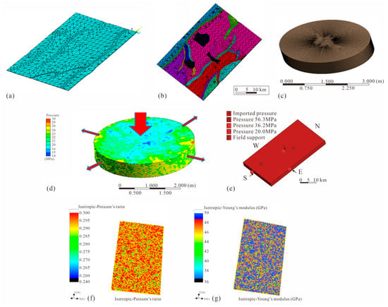 The numerical simulation process of fluid–structure interaction. ((a) is establishment of geological model; (b) is meshed geological model; (c) is the divided watershed grid; (d) shows the water injection calculation and fluid analysis; (e) is the loading formation stress; (f) shows the isotropic Poisson’s ratio; (g) refers to the isotropic Young’s modulus).