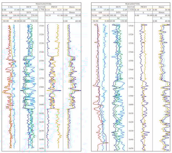 This section integrates fractal geometry and fractional calculus to analyze the multiscale heterogeneity of mechanical parameters and in situ stress fields in the studied geo-energy system, exemplified by wells G621 and G61. The Young’s modulus, Poisson’s ratio, vertical principal stress, and horizontal principal stresses (HPSs) were evaluated through a fractal–fractional framework (Equations (1)–(7)) to quantify their spatial variability and scale-dependent interactions (Figure 4). For well G621, Young’s modulus exhibited fractal spatial patterns, ranging from 20.2 to 60.5 GPa (mean: 25.7 GPa), with higher values concentrated in the middle strata, reflecting a fractional-order elasticity gradient aligned with lithological discontinuities. The Poisson’s ratio (0.14–0.175, mean: 0.165) followed a power-law scaling relationship, indicating weak plasticity and fractal clustering of deformational behavior. The vertical principal stress (30–50 MPa) and maximum HPS (30–60 MPa, mean: 43.5 MPa) demonstrated multifractal characteristics, where stress anomalies in the mid-section (45–65 MPa) correlated with fractional stress memory effects induced by pre-existing fracture networks.