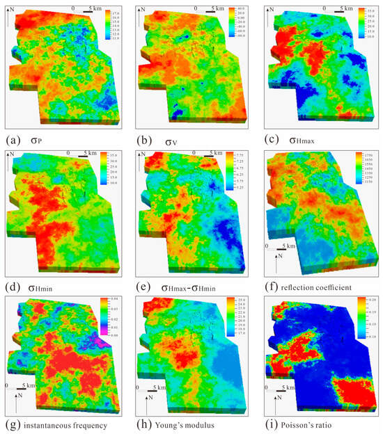 The developmental characteristic of current in situ stress. ((a) is pore pressure, MPa; (b) shows vertical principal stress, MPa; (c) indicates maximum HPS, MPa; (d) shows minimum HPS, MPa; (e) represents stress intensity, MPa; (f) indicates the reflection coefficient; (g) shows the instantaneous frequency; (h) represents Young’s modulus, GPa; (i) shows Poisson’s ratio).