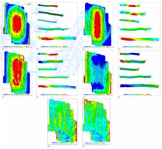 The simulated results of current in situ stress and fracture parameters. ((a) is the developmental characteristic of minimum HPS; (b) indicates the profile feature, the crosslines were shown in (a); (c) refer to developmental characteristic of maximum HPS; (d) shows the profile feature, the crosslines were shown in (c); (e) shows the developmental characteristic of vertical principal stress; (f) refers to profile feature, the crosslines were shown in (e); (g) refers to the distribution characteristics of stress intensity; (h) shows the profile feature, the crosslines were shown in (g); (i) shows the fracture linear density; (j) is fracture aperture).