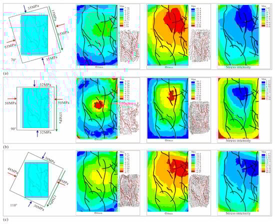 The developmental characteristic of in situ stress under distinct loading directions. ((a) shows simulated results under loading direction of 70°; (b) shows simulated results under loading direction of 90°; (c) refers to simulated results under loading direction of 110°. The relative magnitude of the loading stress was shown in the Figure, and the angle was defined as intersection angle between maximum HPS and the eastern boundary).