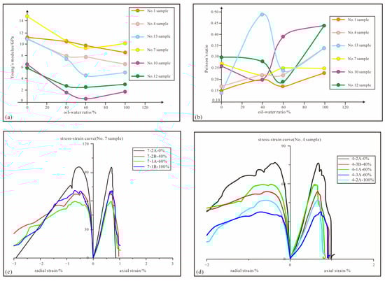 The relationship between OWR and rock’s mechanical properties. ((a) refers to relationship between OWR and Young’s modulus; (b) shows relationship between OWR and Poisson’s ratio; (c) indicates stress–strain curve of No.7 sample; (d) refers to stress–strain curve of No.4 specimen).