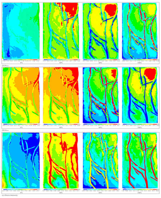 The developmental characteristics of simulated in situ stress with various OWR. ((a) shows minimum HPS with various OWRs (0%, 40%, 60%, and 100%); (b) shows maximum HPS with various oil–water ratios; (c) refers to the stress intensity with various oil–water ratios).