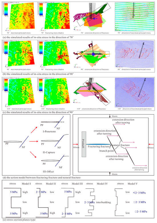 The extension direction and model of fracturing fracture. ((a) is simulated results of stress before and after fracturing in direction of 70°; (b) shows simulated results of stress before and after fracturing in direction of 90°; (c) refers to simulated results of stress before and after fracturing in direction of 110°; (d) is the action mode between fracturing fractures and natural fractures; (e) refers to stress section planes type).