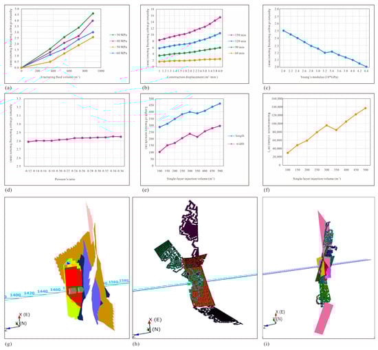 The changing characteristics of fracturing fracture’s parameters during the fracturing process. ((a) is relationship between major fracture’s aperture and fracturing fluid volume; (b) shows relationship between major fracture’s aperture and construction displacement; (c) refers to relationship between major fracture’s aperture and Young’s modulus; (d) shows relationship between major fracture’s aperture and Poisson’s ratio; (e) is relationship between fracturing fracture length and single-layer injection volume; (f) refers to the relationship between the reconstruction volume and single-layer injection volume; (g) is the major fracturing fracture; (h) indicates activation of natural major fracture; (i) shows inducing of the natural major fracture).