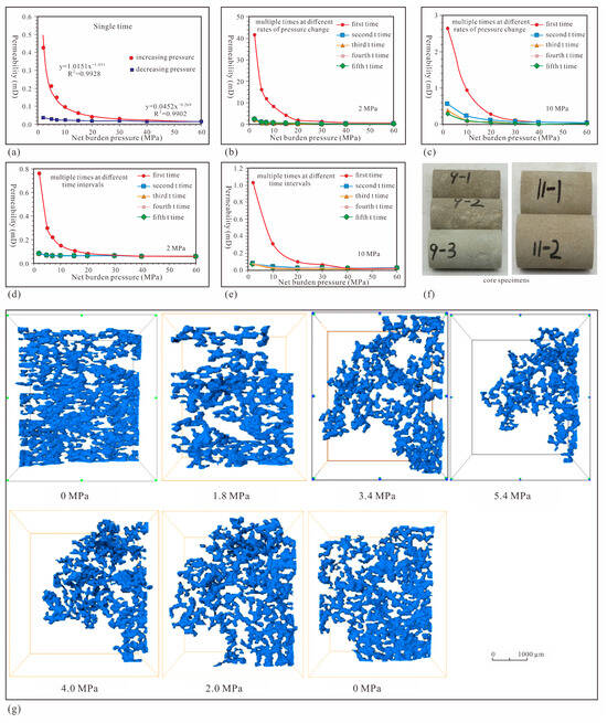 The response characteristics of permeability on the stress sensitivity. ((a) is relationship between permeability and net burden pressure in single time; (b) shows relationship between permeability and net burden pressure multiple times at different rates of pressure change (2 MPa); (c) refers to relationship between permeability and net burden pressure in multiple times at different rates of pressure change (10 MPa); (d) is relationship between permeability and net burden pressure in multiple times at different time intervals (2 MPa); (e) shows relationship between permeability and net burden pressure in multiple times at different time intervals (10 MPa); (f) refers to the core specimen; (g) is relationship between fracture aperture and stress variation).