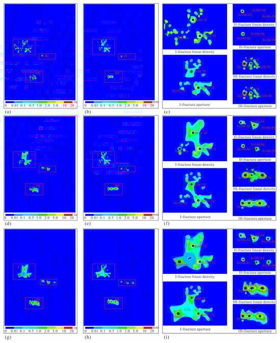 The fracturing simulation results of fluid–structure coupling. ((a) shows distribution characteristics of fracture linear density during first fracturing wells; (b) is distribution characteristics of fracture aperture during first fracturing wells; (c) refers to local distribution characteristics of fracture linear density and aperture in area I, II, and III during first fracturing wells; (d) is the distribution characteristics of fracture linear density during the second fracturing wells; (e) shows the distribution characteristics of fracture aperture during the second fracturing wells; (f) refers to the local distribution characteristics of fracture linear density and aperture in area I, II, and III during the second fracturing wells; (g) is the distribution characteristics of fracture linear density during the third fracturing wells; (h) shows the distribution characteristics of fracture aperture during the third fracturing wells; (i) is local distribution characteristics of fracture linear density and aperture in area I, II, and III during the third fracturing wells).