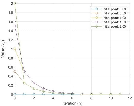 Thus, in all cases, . Hence, is -closed, and (since ). Finally, it is evident that is not continuous. Let be a -preserving sequence in X such thatwith for all . Since , it follows that for every j. As the interval is closed in X, we have for all j. Therefore, is -self-closed. It is also easy to prove that Consequently, all the assumptions of Theorem 2 are met; therefore, T has a unique fixed point, namely . The convergence behavior of the Krasnoselskij iteration is clearly illustrated in Table 1, showcasing the numerical results for selected initial points, and this is further visualized in Figure 1, demonstrating the iterations. These representations highlight the method’s efficiency and stability. Remark 2. It should be noted that Example 1 plays a crucial role. In this example, the mapping T is neither a χ-contraction in the sense of Jleli and Samet, (since T is not continuous) nor an enriched contraction, as proposed by Berinde and Pecurar, as it is neither a self-mapping nor continuous. It is also clear that by taking and with , we observe thatindicating the absence of any , satisfying (1). Moreover, it does not satisfy the conditions of an enriched -contraction, as defined by Rizwan et al. [14]. However, within our framework, T qualifies as an enriched -contraction. Hence, our results provide a proper generalization of the existing work. Example 2. Let and with the usual norm . Let be a mapping defined byand construct a binary relation . Since T is not continuous, it is not a Banach contraction, an enriched contraction, nor even a JS-contraction, as discussed in [1,3,11]. It can be also seen that for and , we have and so we cannot find any for any such that it satisfies the following inequality with : Therefore, it is not an enriched -contraction, introduced by Rizwan et al. in [14]. However, taking implies , and hence the operator T coincides with its averaged operator . Notice that there exists such that ; moreover, whenever , then , showing that the binary relation is T-closed. Finally, for any , we obtainand hence the inequality in Definition 12 holds for all , that is, T is an enriched -contraction. As all assumptions of Theorem 1 are satisfied, T has a fixed point. Next, we present another fixed point result, which is the generalization of Theorem 1, and it is stated as follows: