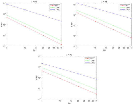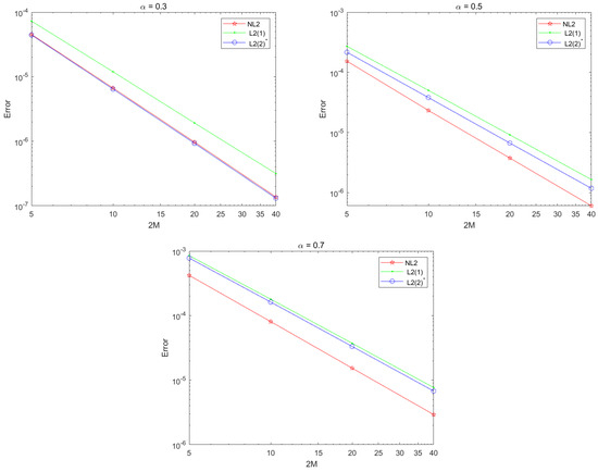 Figure 2. Therefore, the accuracy of the numerical solution at the first time step has a substantial impact on the accuracy of the numerical solution at subsequent time steps. It can also be observed that the numerical solutions obtained by the NL2 scheme are better than those obtained by the L2(1) scheme, the L2(2) scheme, and the