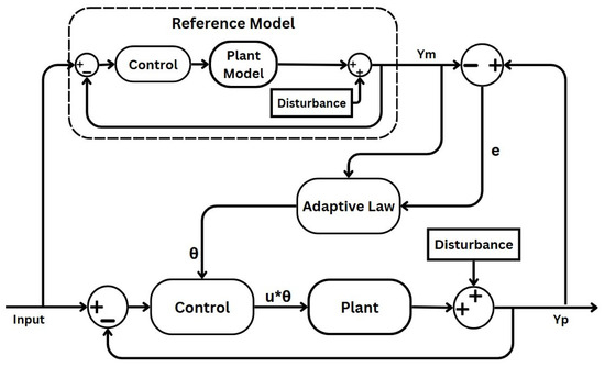 The central concept of MRAC strategies is to guarantee that the system’s behaviour aligns with a predefined model, regardless of uncertainties and changes in system dynamics. The key parts of a MRAC scheme are given as follows [39,40]: