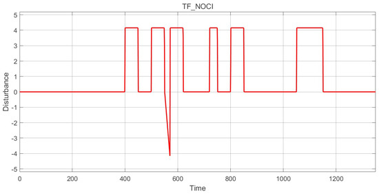 The desired MRAC scheme must maintain stability through disturbance rejection (surgical stimulation) and other interventions. The suggested control structure must be tested by modelling and introducing a surgical stimulus disturbance, as EEG-based indices (such as BIS) are insufficient for indicating the degree of analgesia without a continuous nociception stimulus. Thus, it is important to employ an accurate simulated model of the surgical stimulus [28]. For this purpose, the simulator created by [29] is chosen. The simulator operates using disturbance models specifically initialised for surgical procedures. The disturbance signal, tailored for surgical actions, serves as the stimulus that passes through the nociceptor pathway. The disturbance simulation attempts to capture the steps of the surgical protocol: intubation, surgical incision followed by a pause for awaiting pathology results, a sudden stimulus after a low-stimulation period, continuous surgical activity, brief intense stimulation during surgery, and finally, the tapering of stimulation during closure [29]. Such events increase the BIS due to pain from interventions which trigger nociceptor responses. Additionally, the disturbance profile includes a bolus of propofol administered by the anaesthesiologist in anticipation of a surgical cut, thus pre-emptively decreasing the BIS level [29]. The final isolated disturbance signal is presented in Figure 3, with amplitude values in the range of [−4.15, 4.15].