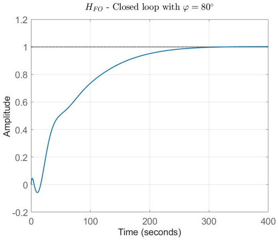 With the controller parameters computed using the formulas presented in Section 2.2, the FO-PI controller and subsequently the closed loop are ascertained. Three phase margins (, or ) are proposed, and after following the design steps detailed previously, each results in their respective control transfer function. The parameters of these controllers are recorded in Table 2.
