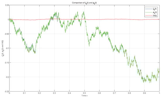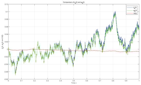 Then, it can be easily verified that the original Equation (21) and averaged Equation (22) satisfy conditions –. According to Theorem 1, we compare the error between the solution of Equation (21) and the solution of Equation (22) for and on the interval . See Figure 1 and Figure 2.