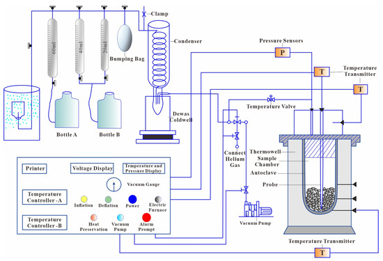 Thermal simulations of hydrocarbon generation were performed using a high-pressure reactor system developed by the Wuxi Petroleum Geology Research Institute of PetroChina Exploration and Development Research Institute. The experimental apparatus, illustrated in Figure 1, comprises five main components: a high-temperature and high-pressure reaction unit, a bidirectional hydraulic control system, an automated hydrocarbon product collection and fluid replenishment system, a centralized control platform, and auxiliary peripheral equipment. The system is capable of reaching temperatures up to 800 °C and fluid pressures up to 100 MPa. To simulate the complete thermal evolution of shale from low-maturity to over-mature stages, experiments were conducted at seven temperature intervals: 350 °C, 400 °C, 450 °C, 500 °C, 550 °C, 600 °C, and 680 °C, corresponding to samples TS-350 through TS-680. Heating was applied at a constant rate of 15 °C per hour, with each target temperature being maintained for 36 h. A closed aqueous system was employed to better replicate the subsurface geological conditions during hydrocarbon generation.