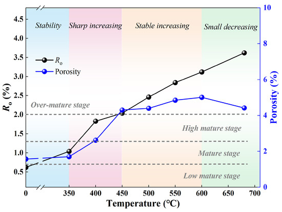 The variation characteristics of the maturity and porosity of samples with temperature.