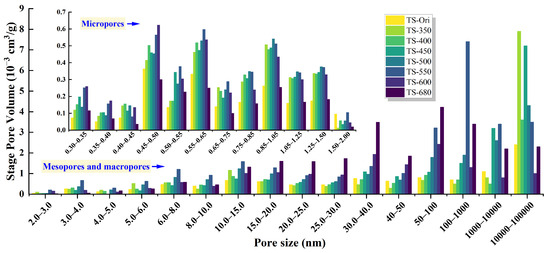 The occurrence of multiphase shale oil and gas is closely governed by the multiscale pore architecture of the shale reservoir [49,50]. Source rocks typically develop a complex network of pores and fractures spanning from the nanoscale to the microscale. By integrating the strengths of LP-CO2 GA, LP-N2 GA, and MIP, a comprehensive and quantitative characterization of micropores, mesopores, and macropores can be achieved across distinct pore size ranges. As thermal maturity increases, pores within the source rock exhibit segment-specific evolutionary behaviors. Figure 3 presents the full-scale distribution of pore sizes ranging from 0.3 nm to 100 µm. The results indicate that larger pores contribute more substantially to the overall pore volume, with macropores accounting for the dominant share. Within the micropore domain, the average pore volume peaks in the 0.45–0.50 nm range. For pores smaller than 15 nm, the thermal maturity sample TS-550 consistently shows the highest pore volume across these size segments. In the 15–100 nm range, the pore volume peak shifts to the most mature sample, TS-680. However, for pore sizes exceeding 100 nm, the peak pore volume begins to migrate toward samples with lower maturity levels.