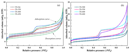The hysteresis loop formed by nitrogen adsorption and desorption isotherms is a characteristic marker for pore type characterization [20]. Figure 4a,b show the hysteresis loop curves for samples at the low- to high-maturity and over-maturity stages, respectively. With increasing thermal simulation temperature (T), a pronounced rise in adsorption is observed near the relative pressure (P/P0) of approximately 0.5. The total nitrogen adsorption capacity increases progressively with temperature, with sample TS-680 exhibiting the highest adsorption volume and the largest hysteresis loop area. This trend is likely attributed to a substantial increase in mesopore development, which enhances capillary condensation effects. Interestingly, the total nitrogen adsorption of sample TS-350 is lower than that of the original sample, TS-Ori. This reduction may result from the initial onset of hydrocarbon generation, during which large quantities of liquid hydrocarbons and bitumen are produced, potentially clogging mesopores and macropore throats. According to the IUPAC classification system, the pore types observed in both the original and thermally matured samples were predominantly of the H2 and H3 types, which are indicative of ink-bottle-shaped and slit-like (plate-like) pores. No consistent correlation between pore type and simulation temperature was identified, suggesting that pore geometry is influenced by additional factors beyond thermal evolution alone.