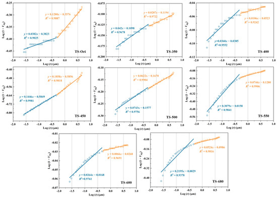 where represents the cumulative mercury volume percentage in the pores with radii exceeding r, the mercury saturation (%); r is the pore radius (μm); rmax is the maximum pore radius (μm); is the fractal dimension, which is dimensionless. The can be calculated from the slope k between and , with the formula = 3 − k.