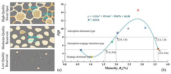 Porosity provides the fundamental basis for storage space, heterogeneity regulates gas distribution and adsorption efficiency, and connectivity governs gas mobility. An ideal reservoir requires a dynamic balance among these three factors. Therefore, the FQI is preliminarily proposed as a quantitative tool for evaluating reservoir quality. Reservoirs characterized by high porosity, high heterogeneity, and low connectivity corresponded to adsorption-dominated systems. In contrast, reservoirs exhibiting medium porosity, low heterogeneity, and high connectivity reflect seepage-dominated systems. The optimal sweet-spot reservoirs are characterized by high porosity, moderate heterogeneity, and high connectivity, offering a favorable balance between storage capacity and flow performance.
