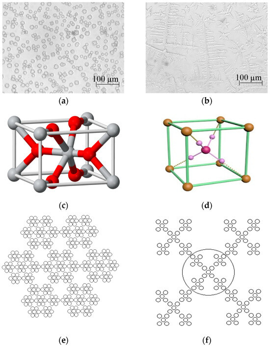 During the experiment, it was found that when adding ammonium hydroxide to the initial solution and then applying one layer of such a solution to the substrate at room temperature, hierarchical flower-like and cross-shaped microstructures are formed (Figure 1a,b). When analyzing the obtained microstructures, the question of the nature of their origin arose. If we turn to the shape of the unit cell of tin dioxide, it is formed by six tin atoms, which in turn are bonded to nine oxygen atoms. Conventionally, such a cell resembles a flower with six petals (Figure 1c). The shape of the unit cell of ammonium chloride is similar to a cross. Since it is formed by four hydrogen atoms bonded to a nitrogen atom (Figure 1d), these microstructures can be fractal in nature. That is, the structures of the smallest size form the same microstructures of the largest size.