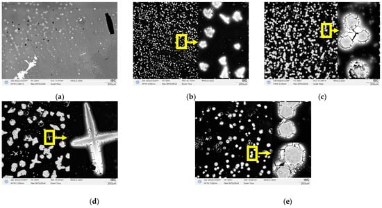 In Figure 2a, rounded microstructures are observed. The spread of microstructures over the film surface is uneven, which may be due to the uneven deposition of solution droplets on the substrate during spray pyrolysis. When 0.2 mL of ammonium hydroxide is added (Figure 2b) to the solution, cross-shaped and flower-shaped microstructures of different sizes from several µm to tens of µm are formed in the film. Figure 2c shows triangular and hexagonal microstructures with sizes of several tens of micrometers. The formation of such microstructures may indicate the formation of an intermediate compound, which was formed as a result of insufficient annealing temperature. The tendency of the microstructures to form conglomerates is noted. Figure 2d demonstrates the presence of both hexagonal and cruciform objects and a flower-like one in the surface structure. This means that the composition contains both the SnO2 (flower) and NH4Cl (cross) microstructures themselves, as well as an intermediate formation. In addition, the size of the microstructures is significantly larger than in the previous samples. The sizes of the microstructures reach several hundred micrometers. But there are also microstructures of the order of several microns, which can also be associated with the rate of droplet settling and the time of their fixation. Figure 2e shows the presence of hexagonal and cruciform microstructures, while flower-like microstructures are not observed. This gives reason to assume the absence of the SnO2 compound in the composition of the films. It should be noted that this assumption is based on the fact that the unit cell of tin dioxide has the shape of a six-petal flower, while in the compound NH4Cl, it resembles a cross.