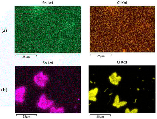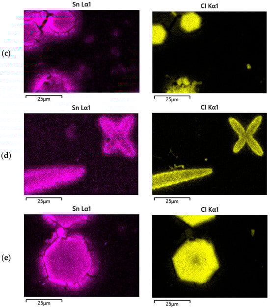 To better understand the distribution of tin, nitrogen, and chlorine in the obtained samples, their mapping was carried out. The results are presented in Figure 4.