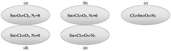 According to Table 2, the film without ammonium hydroxide additive (a) contains about 69% tin, about 18% oxygen, and about 12% chlorine, while elemental analysis showed no nitrogen content at all. The film containing 0.2 mL ammonium hydroxide (Table 2, (b)) also does not contain nitrogen. The Sn content in it is about 55%, chlorine ~30%, and oxygen ~14%. In the film with the addition of 0.4 mL ammonium hydroxide (Table 2, (c)), the Sn content is ~39%, which is much less than in samples (a) and (b). It should be noted that the microstructures here also have a different shape than in sample (b). However, the chlorine content is ~48%, which is greater than in samples (a) and (b). The oxygen content here is ~12%. In addition, the nitrogen content is shown to be ~0,5%. Whereas in the previous samples, the analysis did not show it at all. According to the sample (Table 2, (d)), the elemental analysis showed the following results: Sn~63%, Cl~20%, and O~17%. The nitrogen content was not detected. With this ratio of elements, three types of microstructures described earlier are formed in the film. In addition, the microstructures are much larger. And finally, when studying the last sample (Table 2, (e)), the content of elements is presented in the following percentage ratio: Sn~42%, Cl~40%, O~16%, N~1.8%. As in sample (c), the presence of nitrogen in the film is noted here. And the microstructures are also presented in a hexagonal shape. Therefore, it can be concluded that the formation of hexagonal microstructures is affected by the presence of nitrogen in the film. Moreover, the ratio of Sn and Cl is approximately the same. That is, it can be said that they are almost in equal proportions. Schematically, this can be represented as follows (Figure 5).