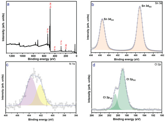 XPS analysis of a thin film containing hexagons in the microstructure: (a) overview spectrum; (b) Sn 3d region with peaks Sn 3d5/2 and Sn 3d3/2, confirming the presence of Sn4+; (c) N 1s spectrum, indicating the presence of nitrogen-containing residues; (d) Cl 2p spectrum with components Cl 2p3/2 and Cl 2p1/2, indicating the presence of chloride impurities.