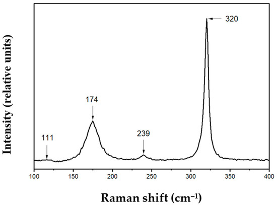 The Raman spectrum of the sample was recorded at room temperature using an excitation wavelength of 632.8 nm on a Jobin-Yvon LabRaman HR800, Horiba. The spectra were recorded in the range from 100 cm−1 to 900 cm−1. Figure 9 shows the Raman spectrum obtained on hexagonal microstructures. The observed peaks are located at ~111 cm−1, 174 cm−1, 239 cm−1, and 320 cm−1. When identifying the obtained vibrational modes, a literature analysis was carried out on possible compounds formed during the chemical interaction of the initial reagents. For the NH4Cl compound, the Raman modes are located in the higher frequency side of the spectrum from 3000 cm−1 and more [30], which does not coincide with the region of the sample spectrum. It has been theoretically and practically confirmed that for all tin oxide phases and mixed tin hydroxochloride complexes, the Raman active modes are located in the region from 50 cm−1 to higher wavenumber values [31,32]. However, for the above-mentioned phases, many vibrational modes are in the corresponding region for our sample. Four peaks from 100 cm−1 to 350 cm−1 are observed in the spectrum of the sample. No peaks are observed in the region of higher frequencies. The compound NH3(CH2)5NH3SnCl6 [33] is the closest in peak intensity and location to the spectrum of our sample. Thus, an intermediate phase may form on the hexagons. The obtained data coincide with the SEM results, where Sn, N2, and Cl are observed on the hexagons.