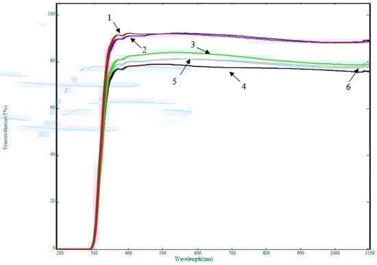 Transmission spectra of samples (annealed at 100 °C): (1) pure glass annealed at 100 °C (red curve); (2) without adding NH4OH (blue curve); (3) + 0.2 mL NH4OH (green curve); (4) + 0.4 mL NH4OH (black curve); (5) + 0.8 mL NH4OH (gray curve); (6) + 1.6 mL NH4OH (blue curve).