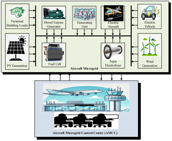 The further development of electric aircraft systems requires providing RESs and an independent AMG system, in addition to the ability to coordinate with other sources such as diesel generators, energy storage systems (ESSs), EVs, EACs, etc. [8]. AMGs relying on RESs, like solar and wind, face several prominent challenges. These include variable energy production and low inertia, which lead to an imbalance between supply and demand, with frequency deviations affecting system stability [9,10]. To address these challenges, strategies such as LFC are implemented to ensure frequency stability, guarantee resiliency, and improve energy quality in AMGs [11].
